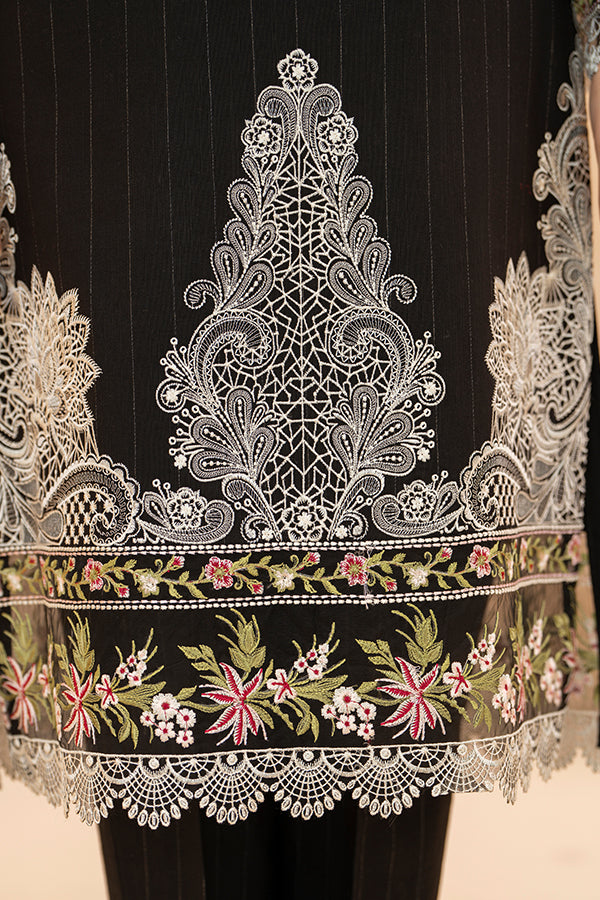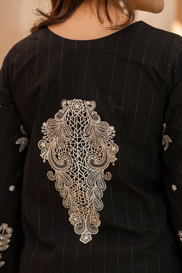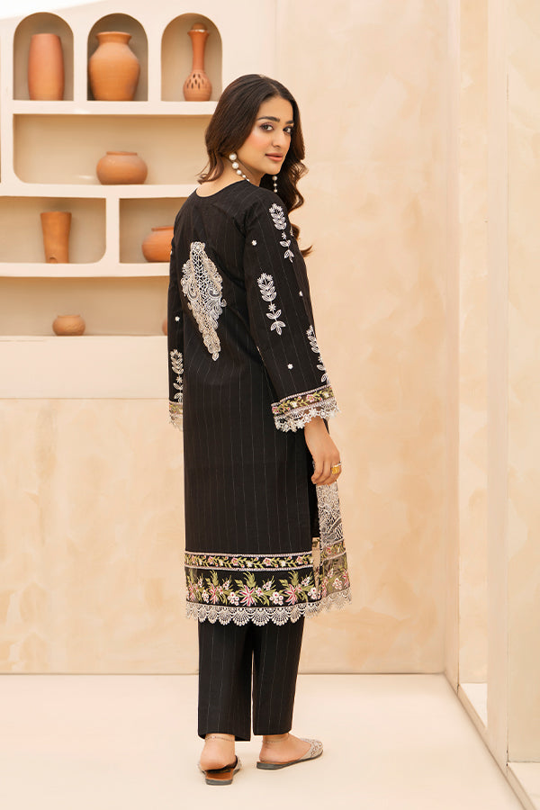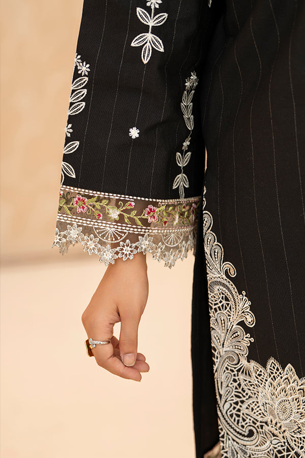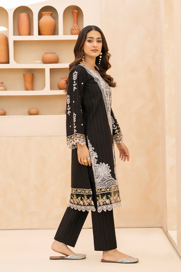 The Oaklyn set includes a completely embroidered black shirt with subtle purple accents all made from textured khaddar cloth. For a well balanced and fashionable look, it is worn with simple textured pants making it perfect for ladies who value comfort and refinement.