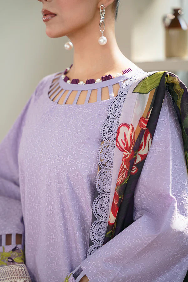 Wearing 3 piece a lilac-hued chikankari dress for women with beautiful tonal stitching, Lilla (B) will transport you to the beauty of a sunny greenhouse. An elegant silhouette is created by the French flowers and cherry blossoms that cascade over the hem. Deep detailing on the sleeves and neckline gives depth, and the muted colour scheme evokes the idyllic summertime.