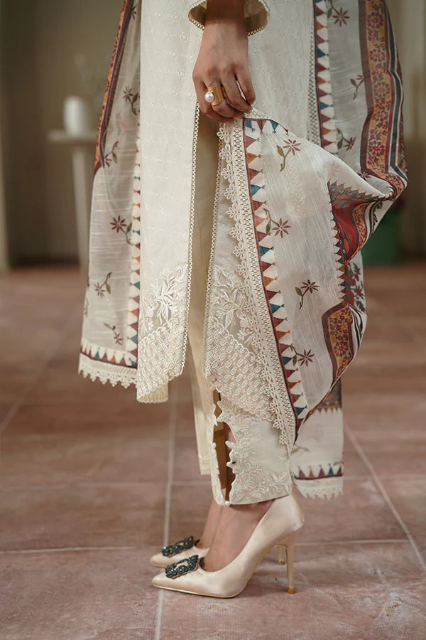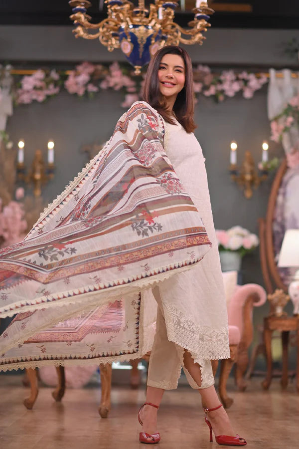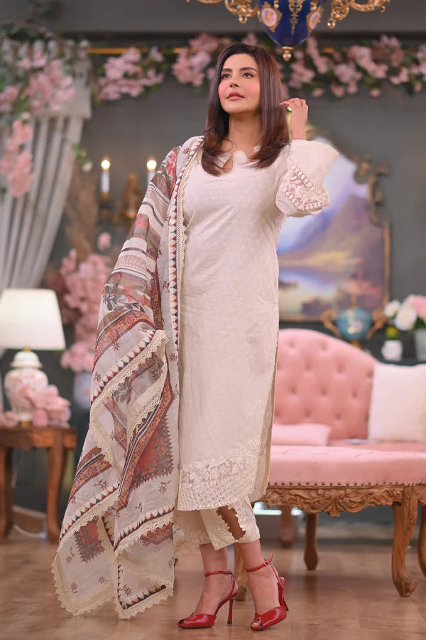 Chikankari embroidery is featured in this costume which also has a delicately embroidered neckline and superb cutwork embellishments for a sophisticated touch. For extra style, it has embroidered cambric trousers and a contrast poly tissue dupatta with lace trims. Available in both embroidered and unstitched variants they offer flare and variety to fit any taste.
