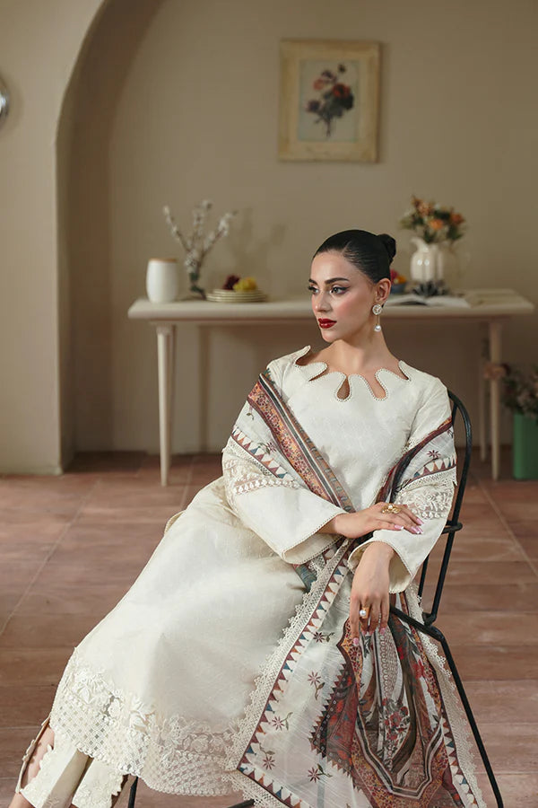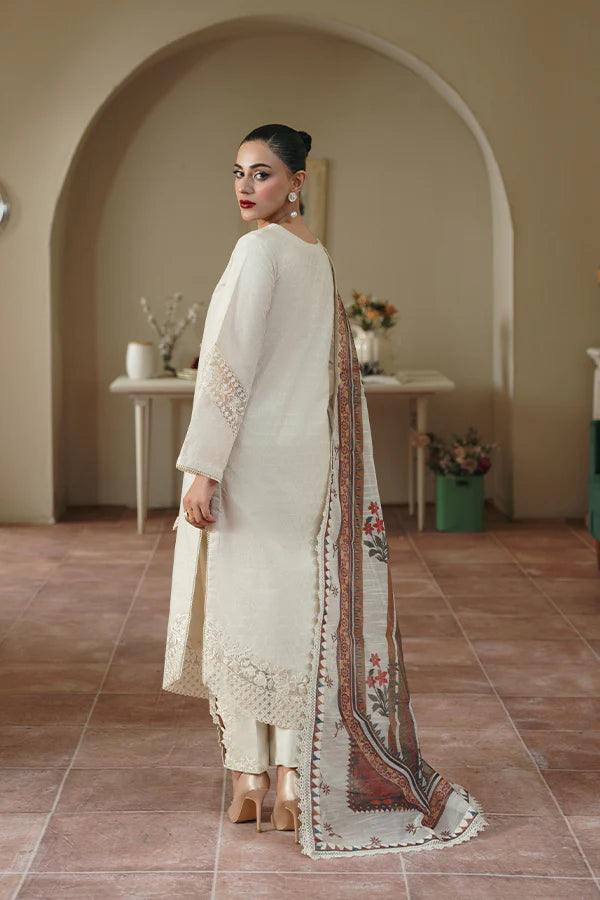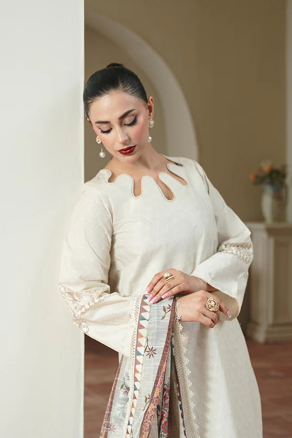 The well made chikankari embroidery and precise cutwork embellishments of Amber's silky skin tone dress give traditional art a modern twist. Its elegant appearance is further enhanced by the beautiful embroidered neckline. Amber creates a refined, feminine style ideal for semi-formal and casual settings when paired with embroidered cambric pants and a contrast poly tissue dupatta with lace borders. Both stitched and unstitched versions are offered.