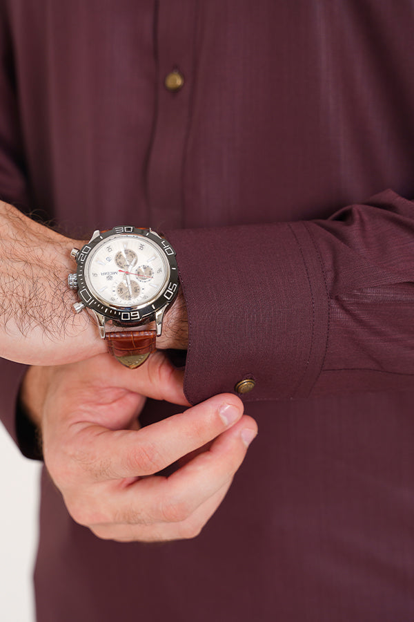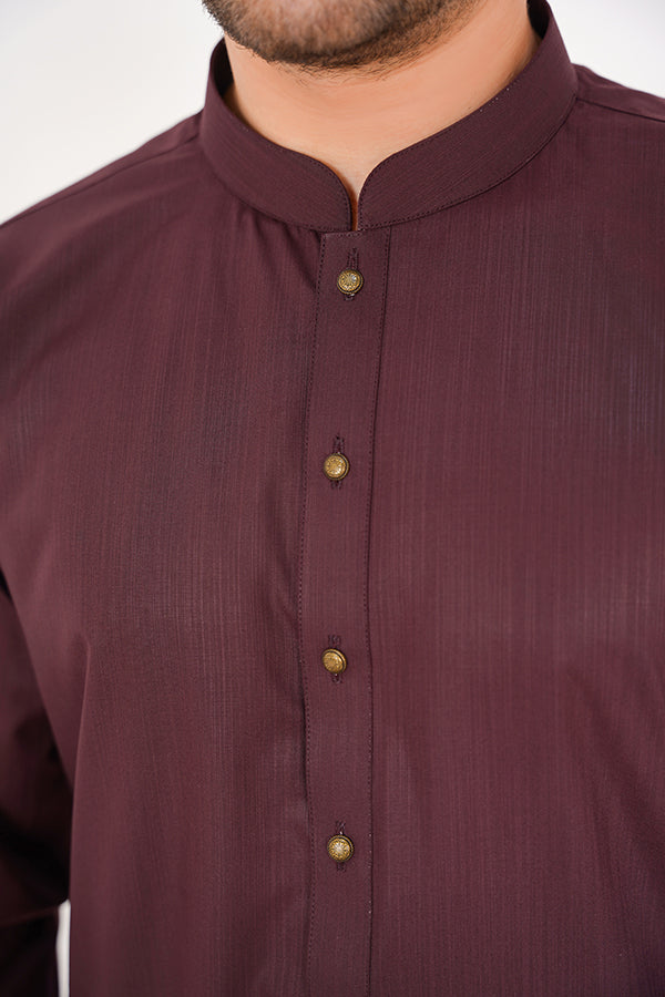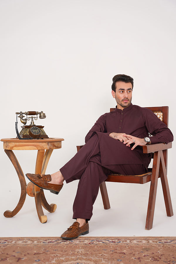 Bring richness to your style with this maroon stitched dress a perfect balance of tradition and modern tailoring. The smart band collar pairs seamlessly with the buttoned placket while the cuff sleeves add a touch of sophistication. Its blended fabric ensures a comfortable fit with a sleek finish, making it a versatile choice for festive gatherings, cultural events or semi formal evenings. With its deep maroon shade this 2 pc dress for men instantly elevates your wardrobe and offers timeless wearability..