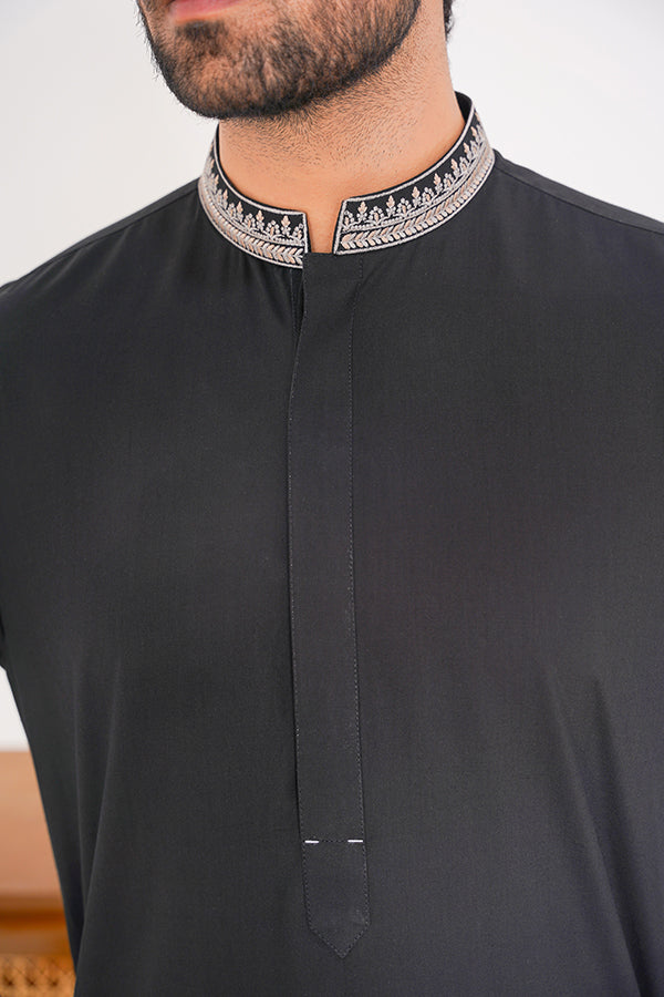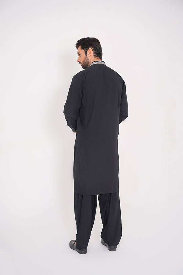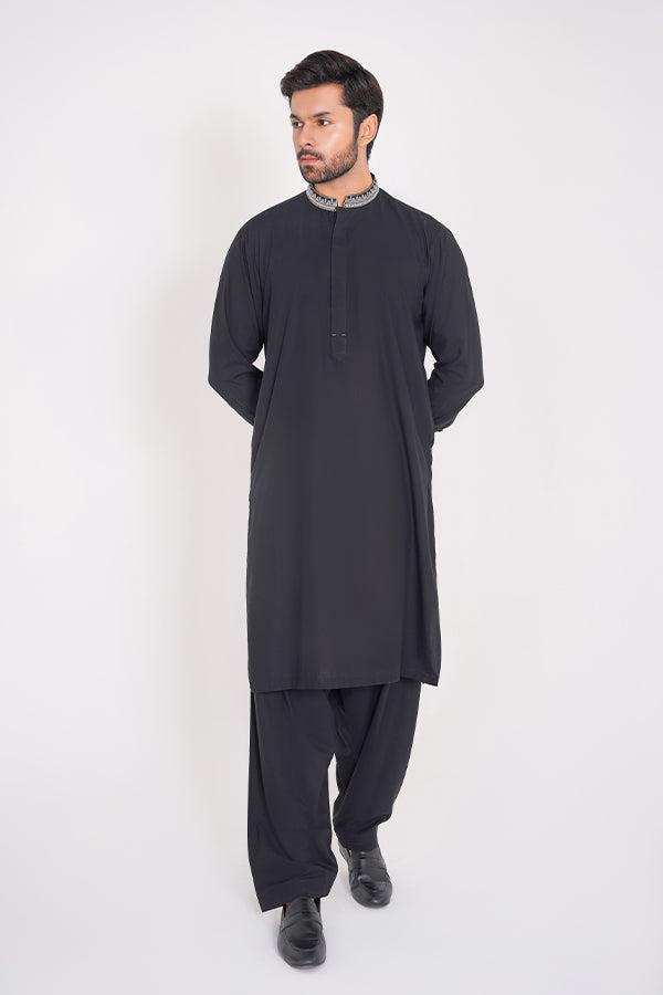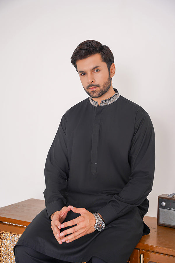 This black shalwar kameez for men from zarlay is a perfect blend of traditional elegance and contemporary design. With an embroidery band collar, invisible button placket, and cuff sleeves, it’s designed to offer both comfort and sophistication for a variety of occasions.