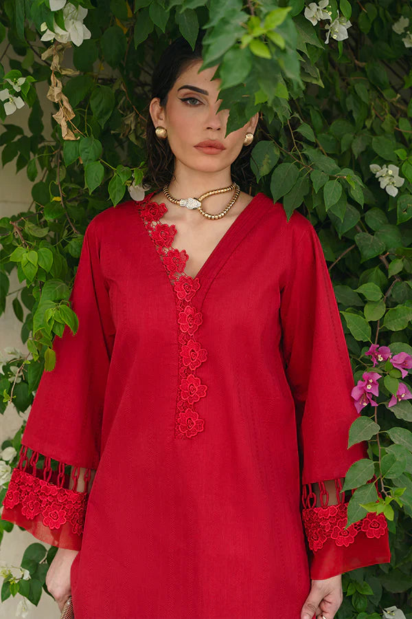 Blaze Bloom, a bold red top and high-quality red color dress for women that seamlessly combines modern and latest flair, and this dress surely charms your beauty. The short round border of the kurta is made of Tarkashi lawn and has floral lace and organza embellishments on the sleeves and collar, offering a sophisticated, feminine touch. This outfit for girls exudes elegance and confidence when worn with a wide-leg farshi shalwar fashioned from quality cambric.
