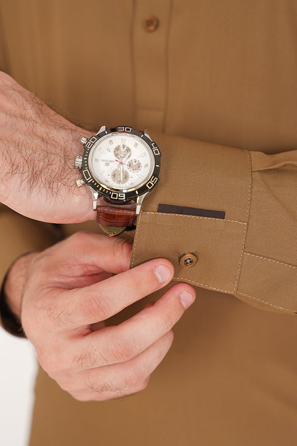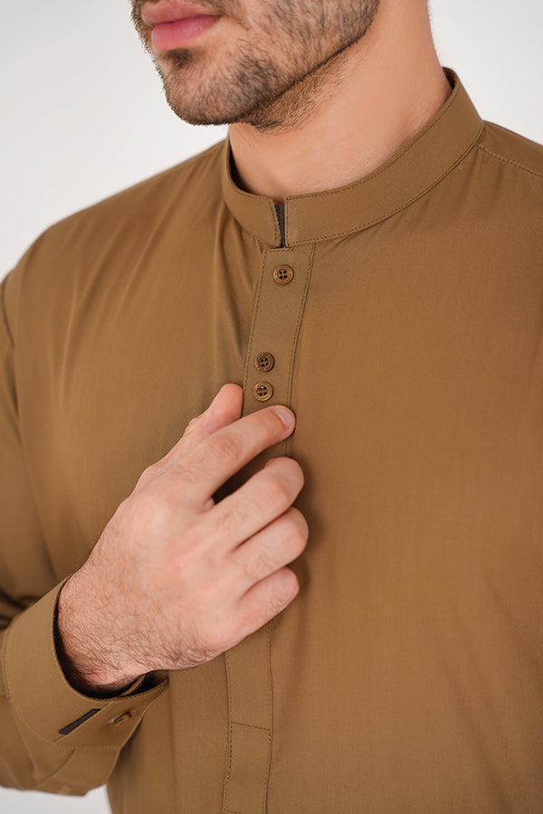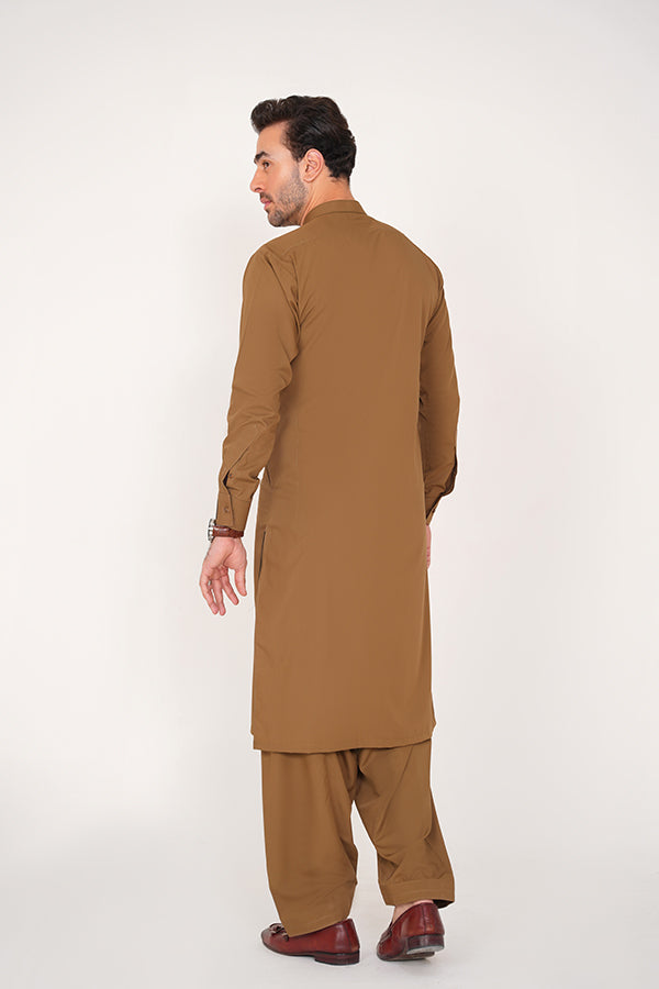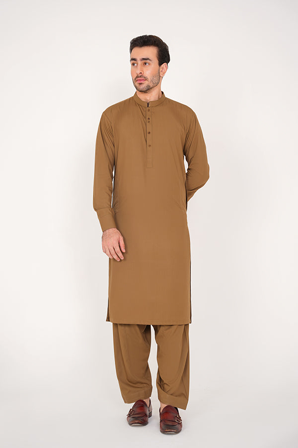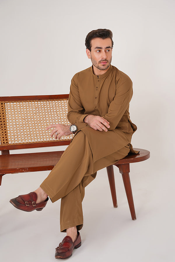 This zarlay caramel shalwar kameez is designed to offer elegance and comfort, featuring a button placket, cuff sleeves and a band collar. Ideal for any occasion it provides a stylish yet comfortable option for both casual and formal events.