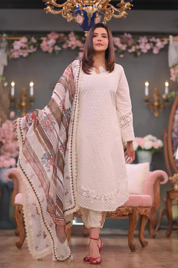 Lace detailing on dupatta borders and pallus. Cutwork accents on shirts, embroidered neckline, and subtle embroidery on trousers. Skin base with dupatta and airy silhouette.