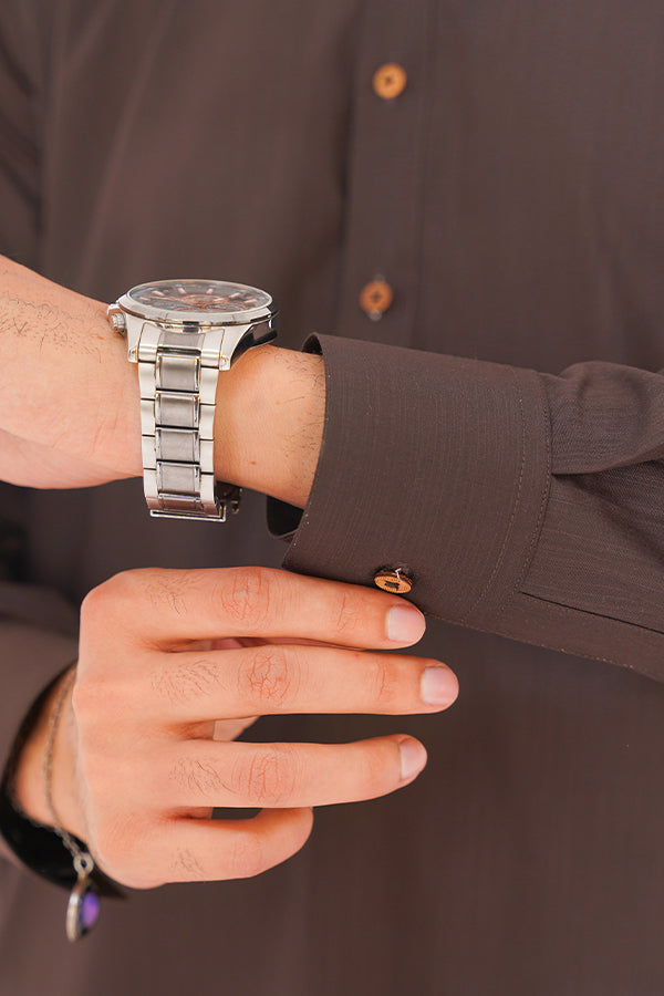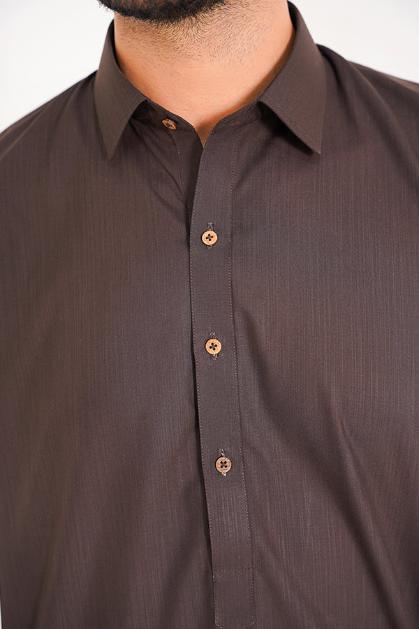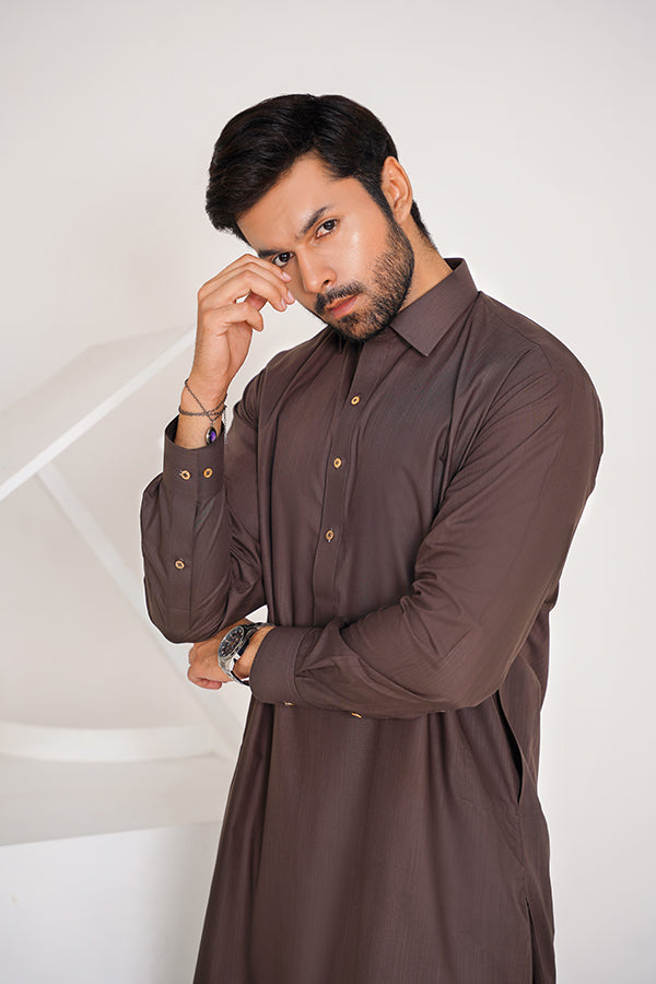 Crafted from premium blended fabric this coffee brown shalwar kameez comes with a shirt collar, buttoned placket and cuffed sleeves providing both style and comfort.