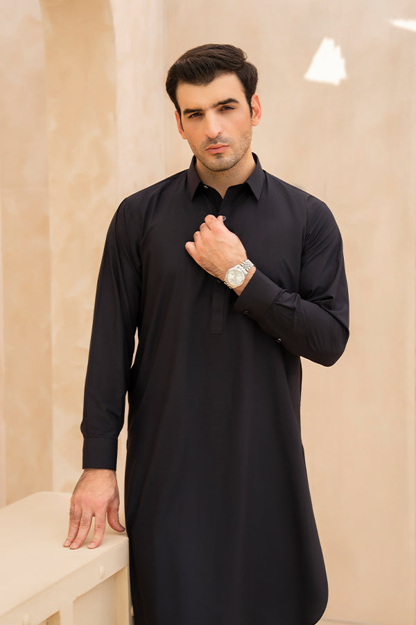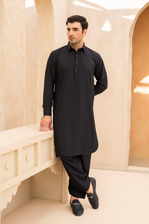 This zarlay Dark Blue Shalwar Kameez for men gives a traditional style and modern look. It delivers a polished appearance appropriate for both professional and informal events, with a visible buttoned placket and a stylish classic collar. A crisp, structured look that radiates classic appeal is produced by the straight hem and cuffed sleeves.