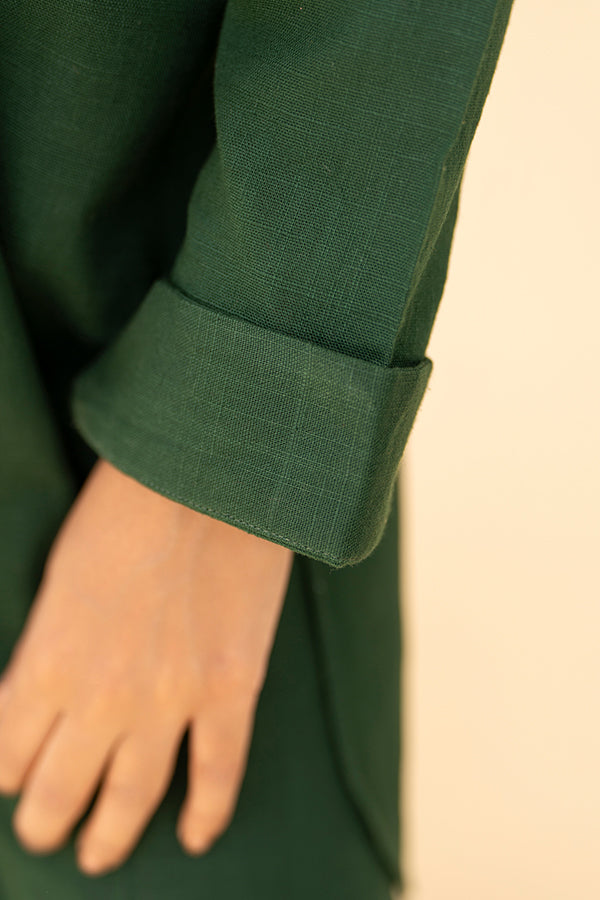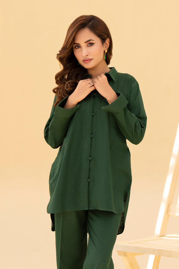 Add an element of elegance to your casual wear with this deep green khaddar co-ord set by Zarlay. With a traditional button down shirt and rolled up sleeves, this outfit is timeless. The matching Straight' pants guarantee a smooth comfortable fit, perfect for day to night looks or everyday wear. This kurta is cut in a simple style and material but the fit, quality of fabric is absolutely stunning.