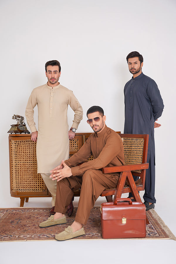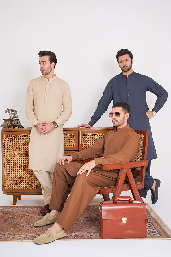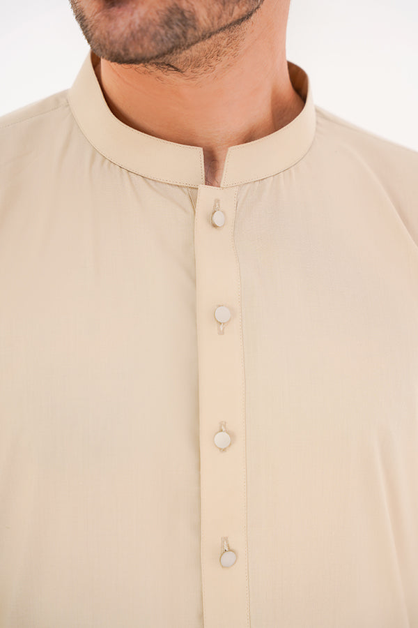 Add a touch of sophistication to your wardrobe collection with our light beige straight kameez, designed for modern men who value comfort and style. Featuring a band collar, buttoned placket and cuff sleeves this kameez blends tradition with elegance with shalwar. Crafted from high quality blended fabric it ensures a polished look that’s perfect for casual gatherings, festive occasions or formal wear..