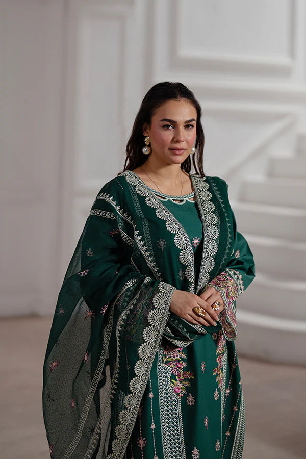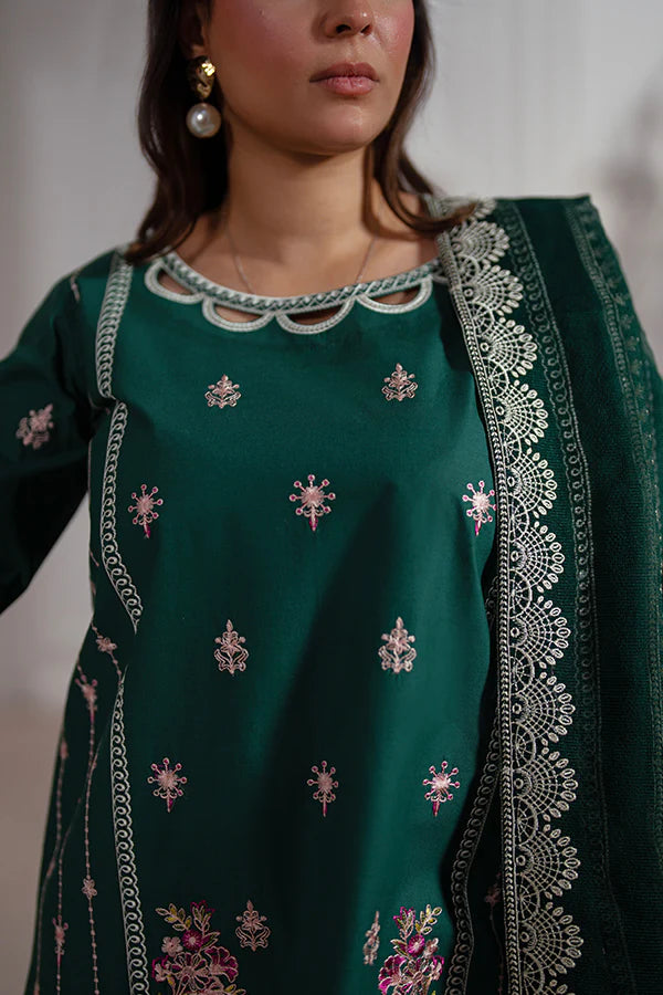 Meera, a deep dark green color, is rich, powerful, and full of character, combining tradition and elegance. The lawn shirt is delicately embroidered with a blend of white, soft pink, and moss green tones inspired by classic flower designs. Detailed borders and strong geometric designs lend a distinctive touch to the costume, giving it a polished and graceful appearance that is appropriate for both informal and celebratory occasions.