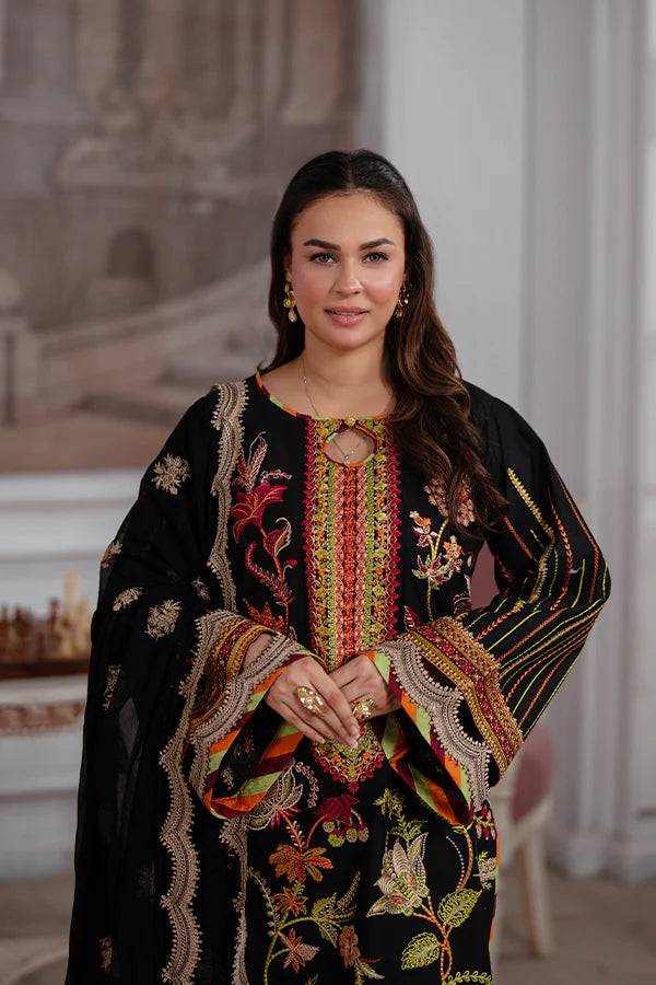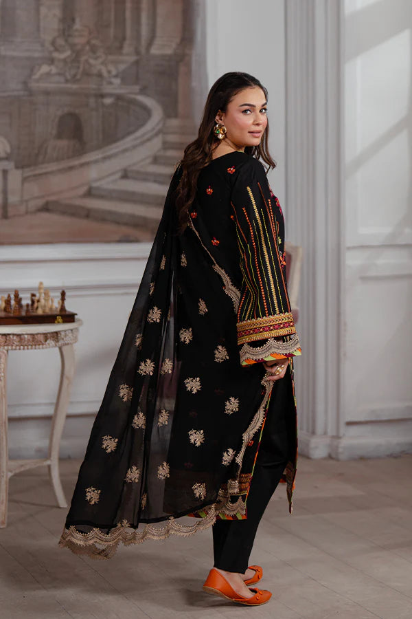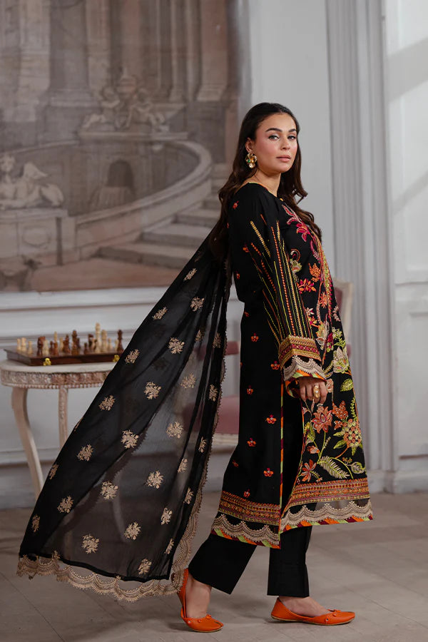 3-piece unstitched lawn suit featuring boho floral embroidery and a chiffon dupatta with golden accents, perfect for timeless elegance with modern grace.
