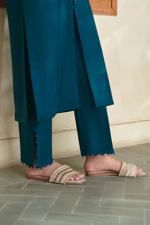 Round buttons in the same tone, delicate front and sleeve details, Full sleeves and straight cut shape, round neckline Zarlay custom-made trousers with scalloped lace patch. Perfect for casual attire.