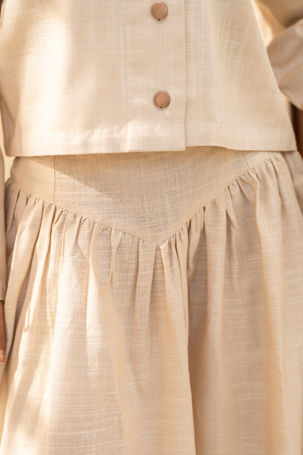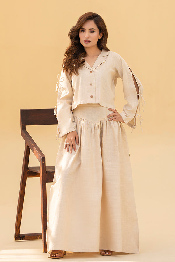 This two-piece off-white Khaddar co-ord set is really fashionable. The cropped shirt top collar, button down front and intricate sleeve enhance the baggy fit. When worn with a high waisted gathered maxi skirt, it creates a charming carefree appearance that is perfect for casual occasions. The natural softness and breathability of khaddar textiles offer all day comfort without compromising design.
