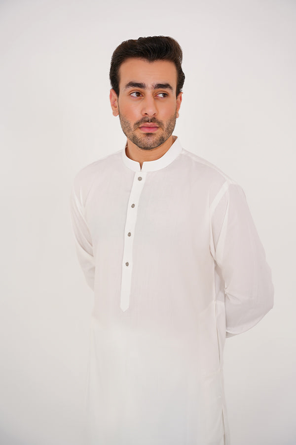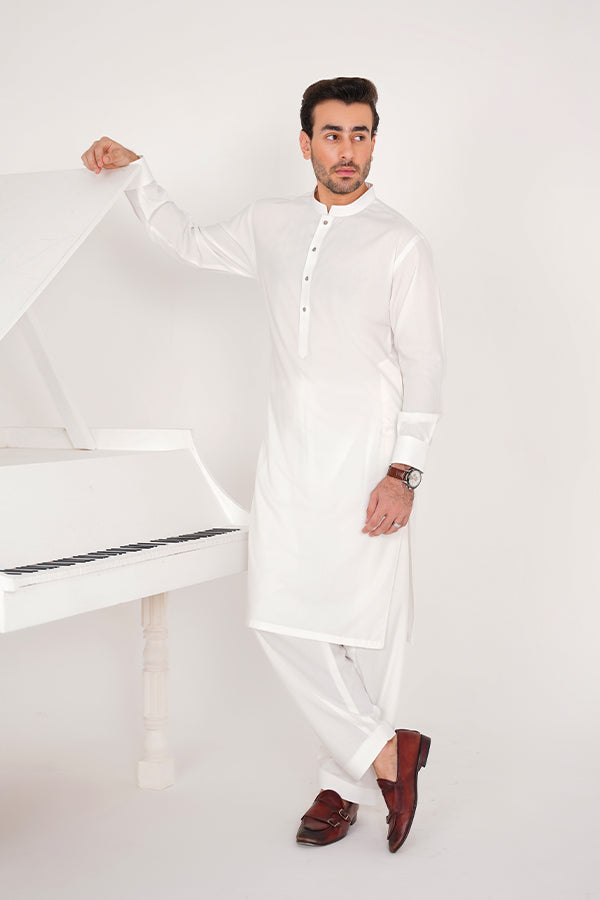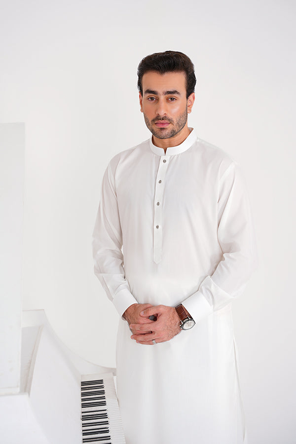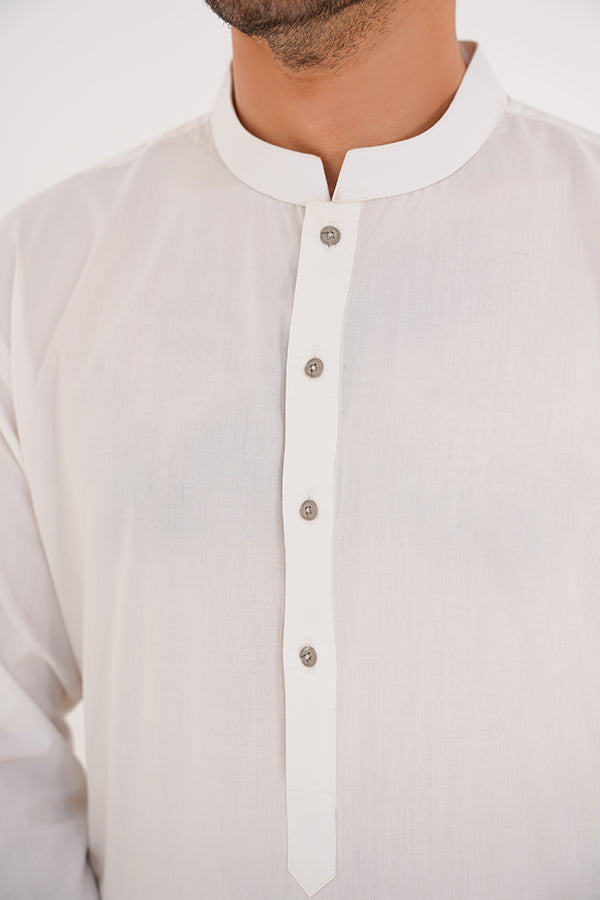 Designed to blend comfort and sophistication this off-white straight kameez will add classic elegance to your collection. With its buttoned placket, cuff sleeves and band collar, this dress for men is ideal for both professional and informal settings. Made from high quality mixed cotton, it has a sophisticated stitched finish that improves your appearance overall and guarantees long lasting comfort.