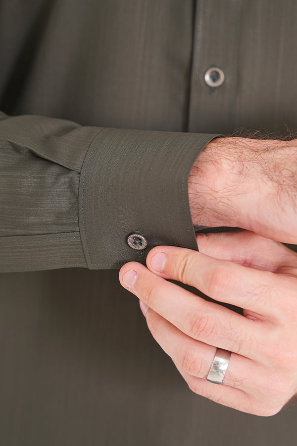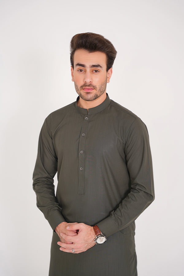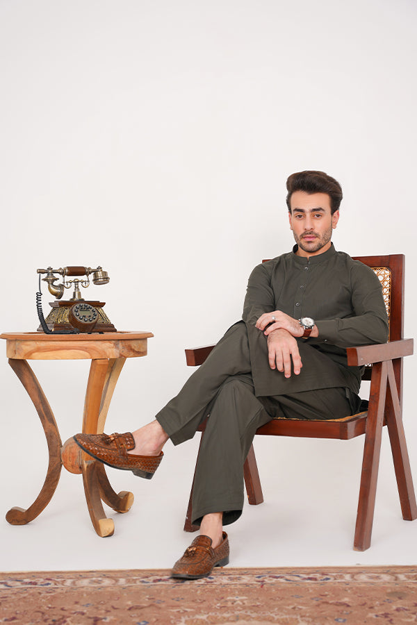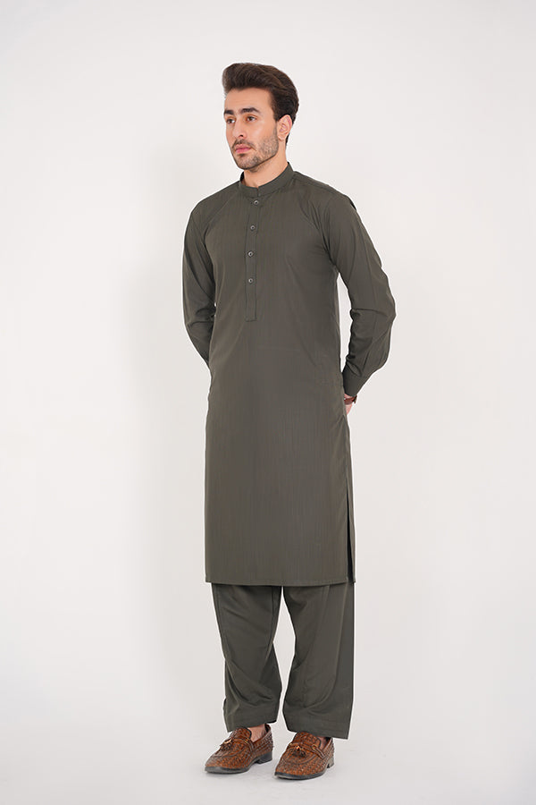 Designed to be both elegant and comfortable this olive green straight kameez with shalwar will let you step into sophisticated style. This kameez buttoned placket, band collar and cuff sleeves give it a latest yet classic look. Constructed from high quality mixed fabric it has a stitched finish that guarantees longevity and a refined appearance, making it ideal for formal events, festive occasions and casual use.