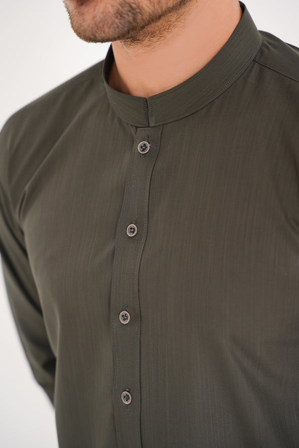 Olive Green Suit for Men – Blended Fabric, Band Collar