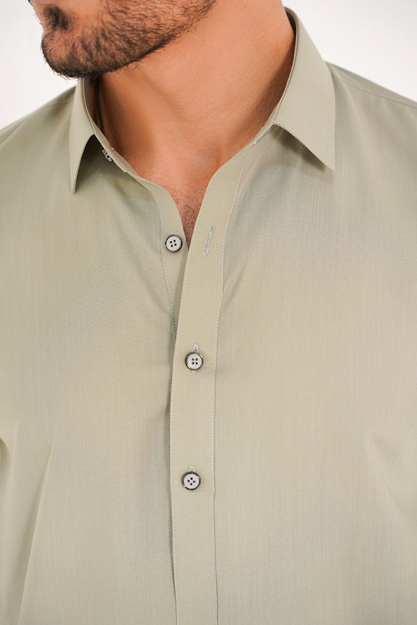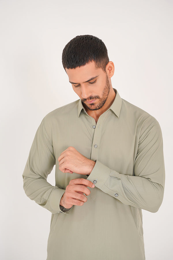 This sage green blended suit for men with shalwar for men features a classic shirt collar, button placket and cuff sleeves offering a comfortable and stylish fit for any occasion.