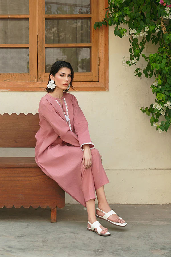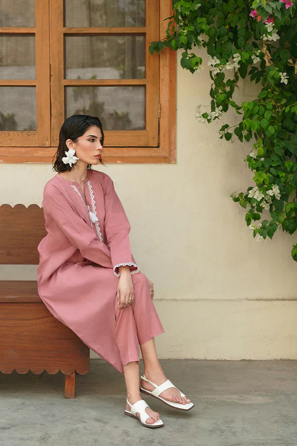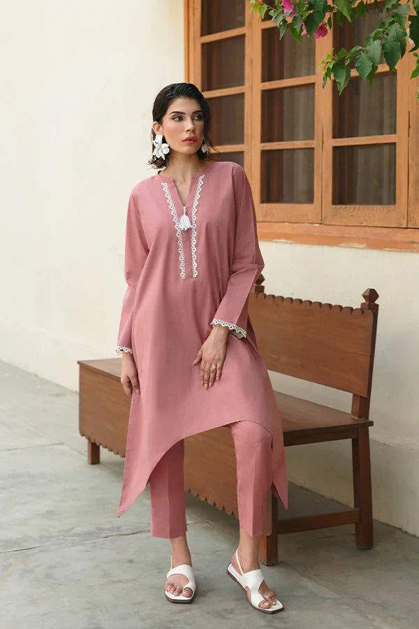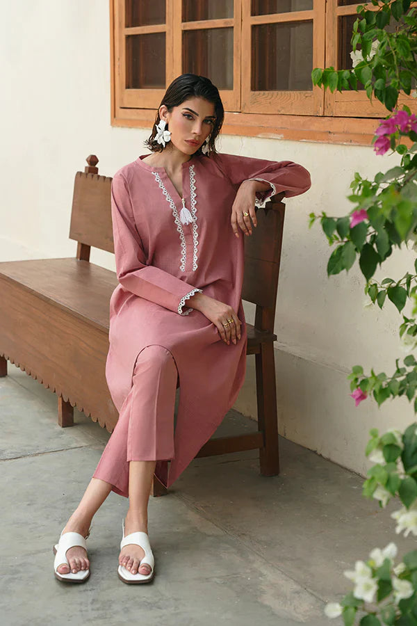 Spring Rose, a stylish tea-pink colored dress for women that combines understated creativity with fashionable flair, is a perfect way to enhance your daily elegance. Made from high-quality textured lawn and the C-cut shirt has a front split with handcrafted pearl tassels and exquisite lace trimming. A delicate, milky white lace embellishes the sleeves, giving them a best look for women. When paired with straight cambric pants, this adaptable ensemble perfectly captures the spirit of ZARLAY.