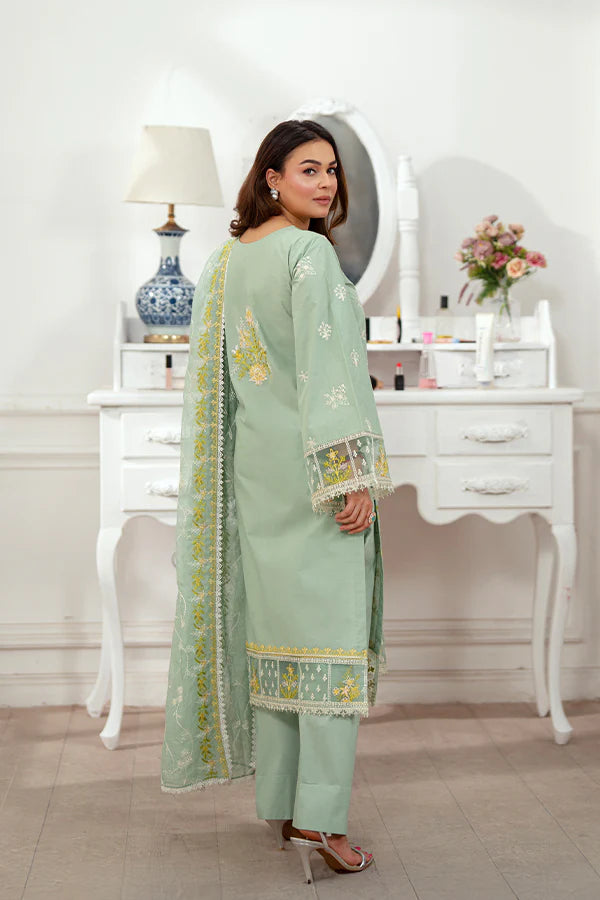 Embroidered lawn 3-piece unstitched suit for women with a soft cotton net dupatta, ideal for adding charm and sophistication to everyday or festive moments.