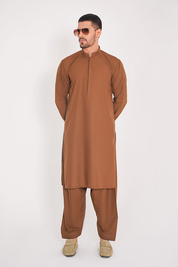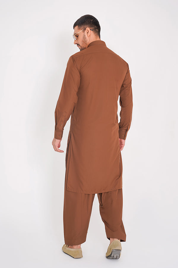 Tan Brown Blended Stitched Suit with Band Collar and Full Sleeves