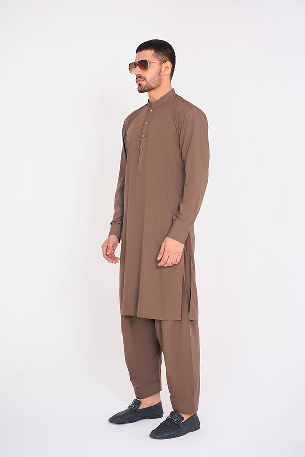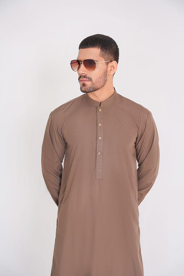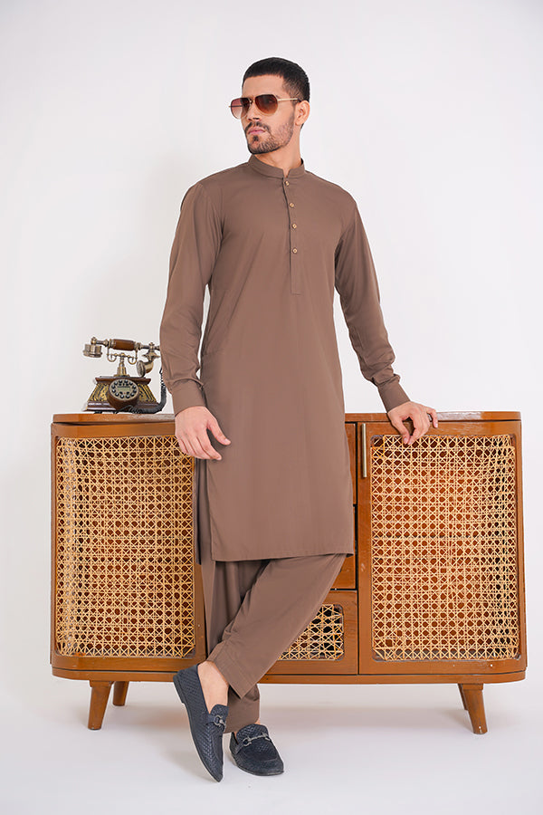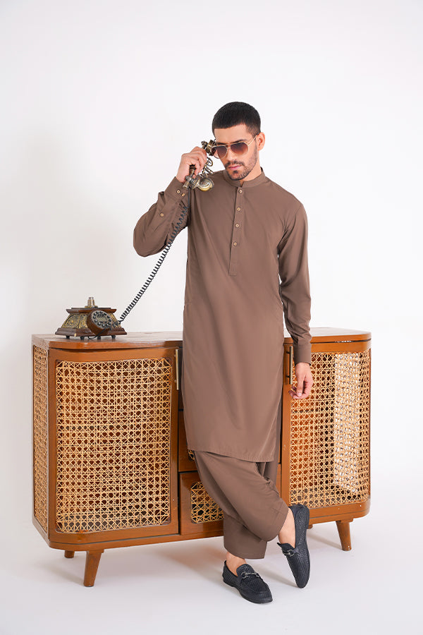 Step out in timeless elegance with this zarlay walnut brown men’s shalwar kameez for men. Designed with a mandarin collar, round cuffs and a straight-fit cut it offers both comfort and sophistication. Ideal for formal and casual wear.